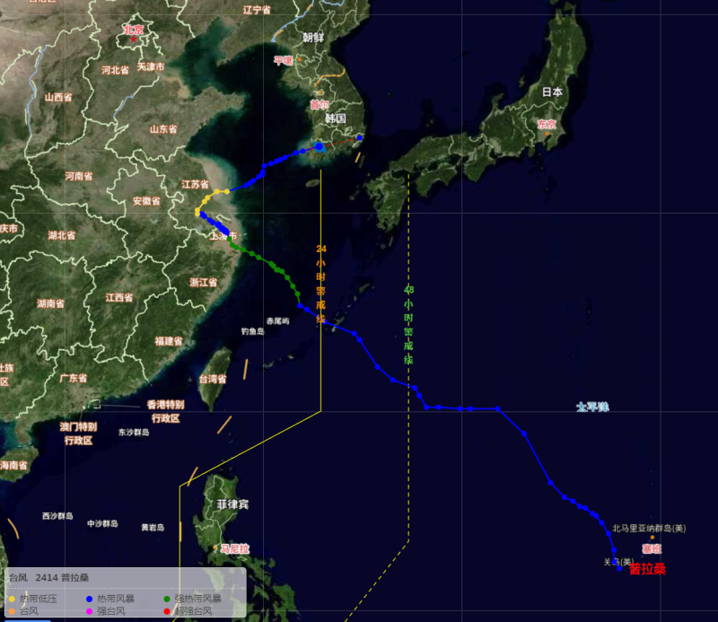 △2024年第14号台风“普拉桑”,在我国两次登陆后旅途发生更始,安稳后的热带低压移入黄海后再次加强为热带风暴。图源:中国欣忭局