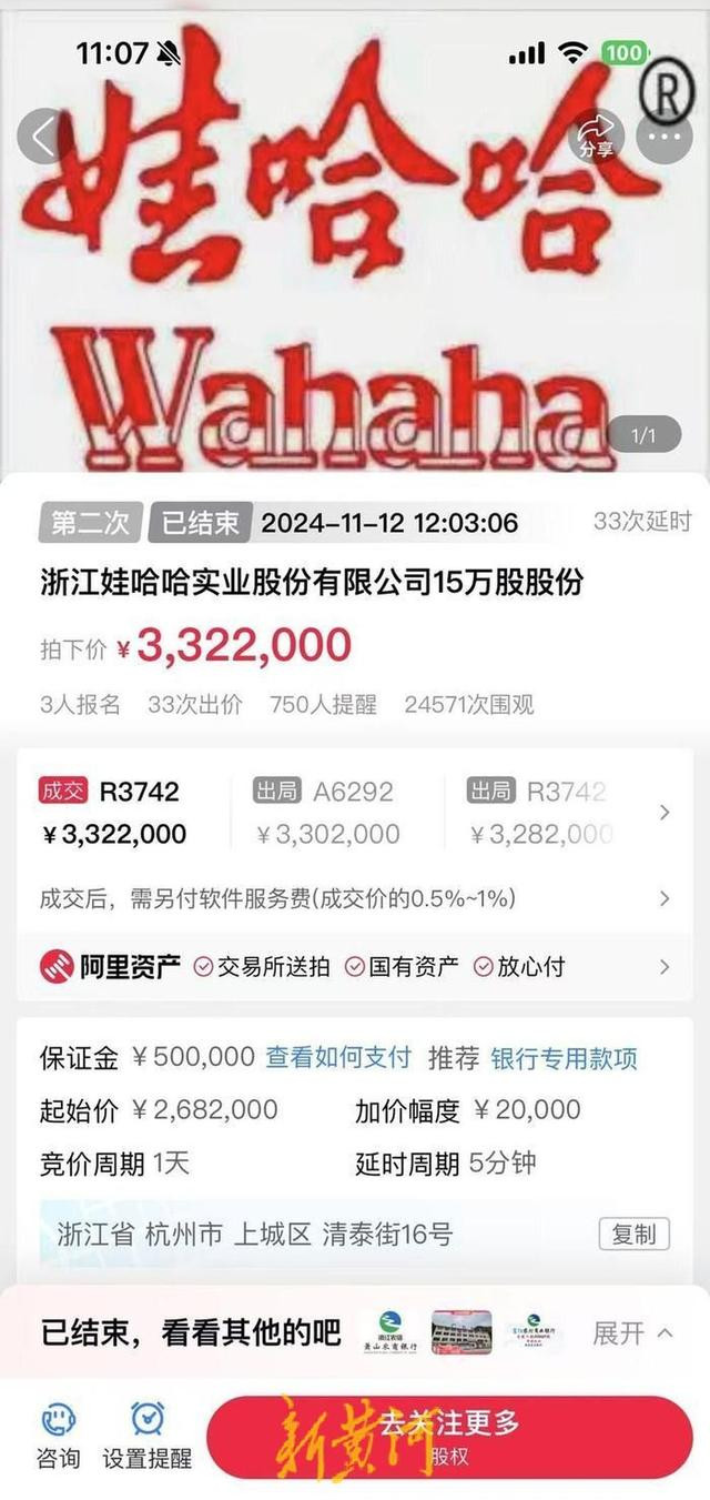 11月12日上昼,在阿里财富平台上,在流程33次延时后,浙江娃哈哈实业股份有限公司(以下简称“娃哈哈实业”)15万股股份以332.2万元成交。